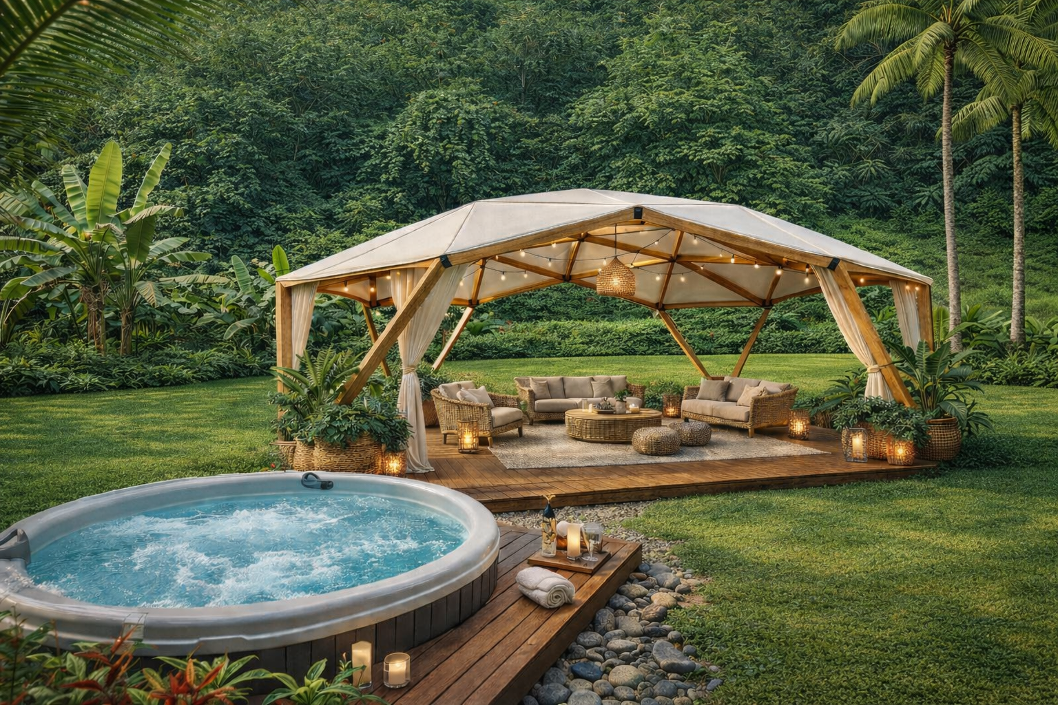 Entièrement personnalisable, il peut être couvert au choix d’une toiture en tôle, en pandanus traditionnel ou en bardeau de bois, permettant de s’adapter à tous les environnements — du style contemporain au plus authentique.