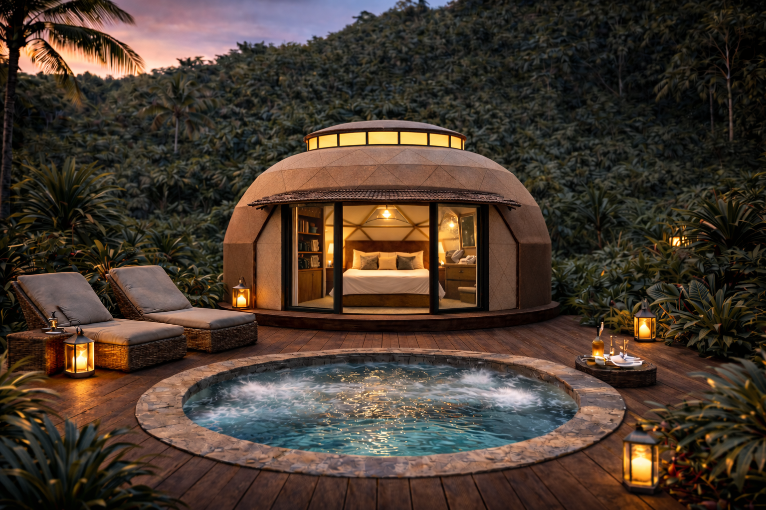 Pensée comme une véritable maison, cette architecture permet l’aménagement complet des espaces de vie : chambres, pièces d’eau, séjour ouvert sur l’extérieur, terrasses couvertes et zones de transition ombragées. La forme géodésique favorise la ventilation naturelle, le confort thermique et la lumière, tout en limitant l’impact au sol.